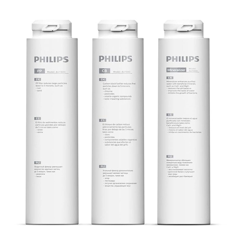Recambio de filtro para el sistema de filtración CB+ PP+Mineralizer AUT3268 en 4 fases filtra una amplia gama de contaminantes para ofrecer un rendimiento superior y duradero. Es capaz de filtrar prtículas de hasta 0,0001 micras, lo que te ofrece una absoluta garantía de la calidad del agua que bebes. Gracias al filtro Mineralizador, aporta al agua minerales beneficiosos como el calcio y el magnesio, mejorando aún más su sabor y restableciendo el nivel de pH para obtener agua más sana y con mejor sabor. Cirtuito integrado para mayor seguridad e higiene, con tanque de 11 litros y flujo de agua de 2 l/min. Compacto. Sistema QuickTwist para cambio de filtros: higiénico y fácil. En nuestra web puedes adquirir los recambios de filtros y membrana RO.