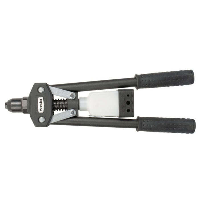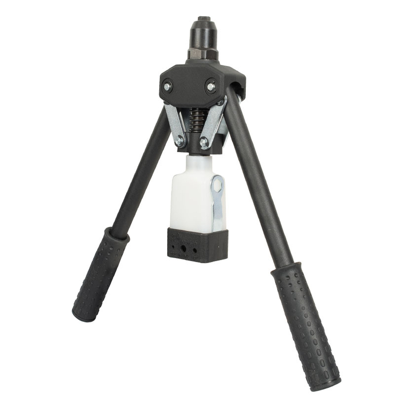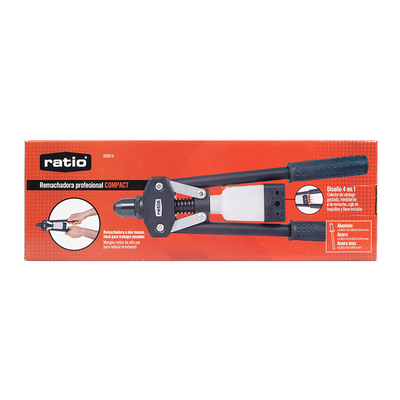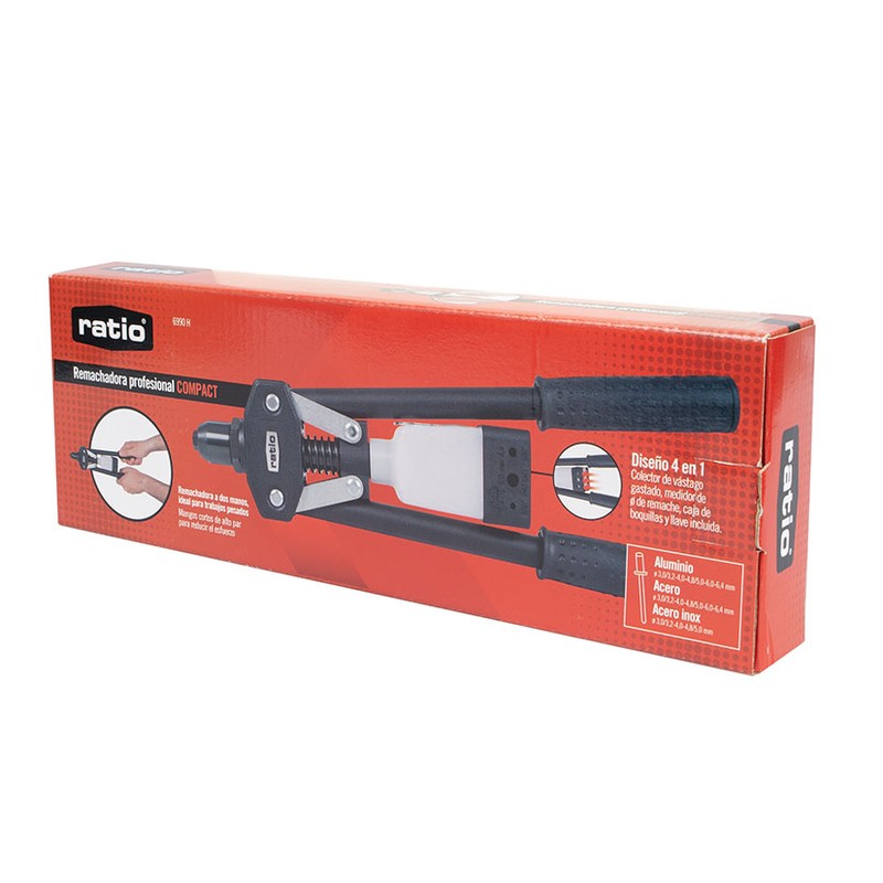 Se trata de una remachadora de dos brazos con maniobra de accionamiento mediante las dos manos. El diseño de los dos mangos cortos de alto par son perfectos para reducir el esfuerzo manual. Se utiliza para colocar remaches de aluminio acero inoxidable y acero. Está equipada con 5 boquillas intercambiables de: 3,2 mm. / 4,0-4,8 mm./ 6,0-6,4 mm. Cambiando la boquilla e instalándola en el cabezal solo tendrás que aplicar una ligera presión para conseguir tu objetivo. Una herramienta sencilla y duradera; 4 en 1 patentado: Contenedor de vástago gastado +MEDIDOR DE AGUJERO DE TAMAÑO DE REMACHE + Caja de almacenamiento de boquillas + Inserto de llave de servicio.. Cumple con la normativa EU REACH SVHC y RoHs. Capacidad de remachado: Remaches de aluminio: ø 3.0 / 3.2, 4.0, 4.8 / 5.0, 6.0, 6.4 mm Remaches de acero: ø 3.0 / 3.2, 4.0, 4.8 / 5.0 / 6.0 6.4 mm Remaches de acero inoxidable: ø 3.0 / 3.2, 4.0, 4.8 / 5.0 mm En nuestra web tenemos recambios para esta remachadora.