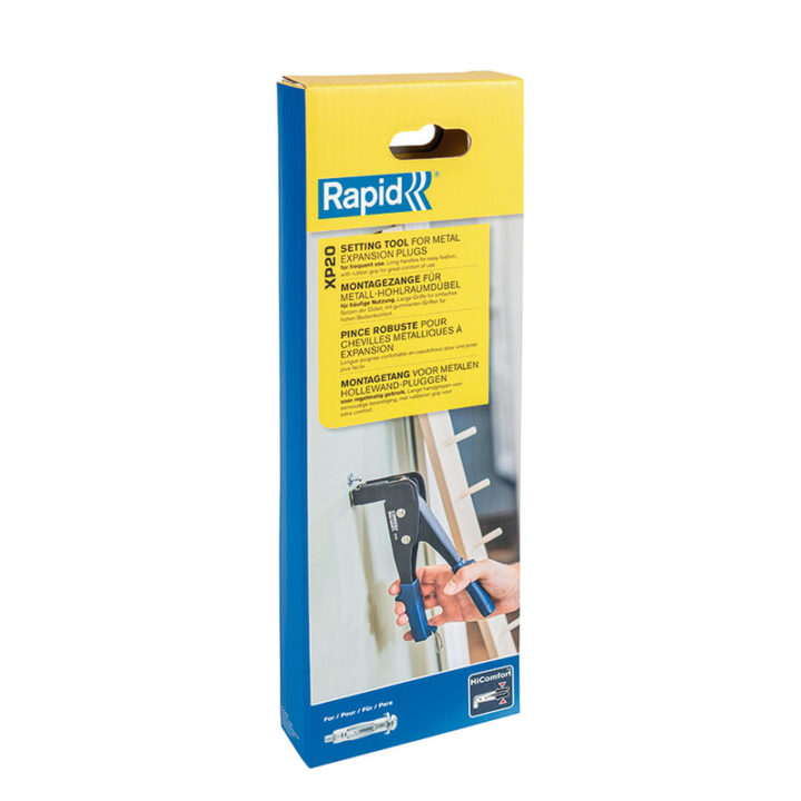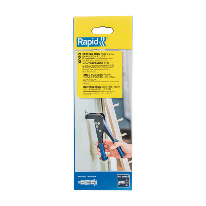 La herramienta de fijación RAPID XP20 está diseñada para un uso frecuente y para los trabajos más exigentes de fijación en placas de yeso y paredes huecas. El cuerpo está fabricado en aleación de zinc un material resistente de alta calidad, el brazo largo la hace perfecta para la fijación de tacos de expansión metálicos en placas de yeso y otros materiales. Las empuñaduras son de goma para un agarre suave y tienen un cierre metálico para su mejor almacenaje. XP20 funciona con todos los tamaños de tacos de expansión metálicos de RAPID, de M4 a M6. Se presenta en una caja.
