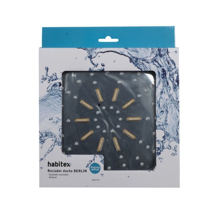 El rociador-difusor para ducha modelo Berlín presenta un diseño elegante. Dispone de un cabezal de 23 cm y está fabricado en plástico ABS cromado con el frontal en gris. Dispone de 1 posición, chorro efecto lluvia y cuenta con picos en la base de silicona que facilitan la limpieza del rociador, evitando que la cal se acumule. Viene presentado en una caja. En nuestra web puedes elegir diferentes modelos adaptándose al diseño y confort que necesites.