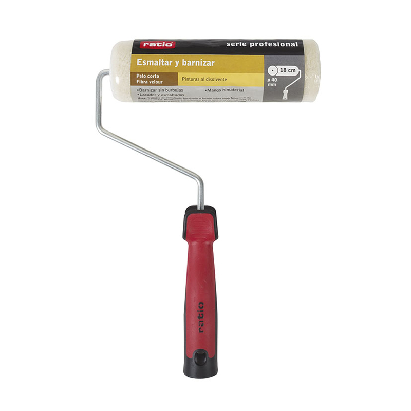 Este rodillo RATIO de la serie profesional de 18 cm de largo está fabricado en fibra 100 % poliamida velour de pelo corto. Es muy versátil y resulta apropiado para trabajos de esmaltado, barnizado o lacado sobre superficies lisas de madera o metal. Además, es resistente a disolventes, puede utilizarse con resinas sintéticas, acrílicas y epoxy; esmaltes, óleos y protectores anticorrosión. Su mango ergonómico es bimaterial rojo y negro para un mejor agarre de la herramienta. La varilla está fabricada en acero y tiene un diámetro de 6 mm.