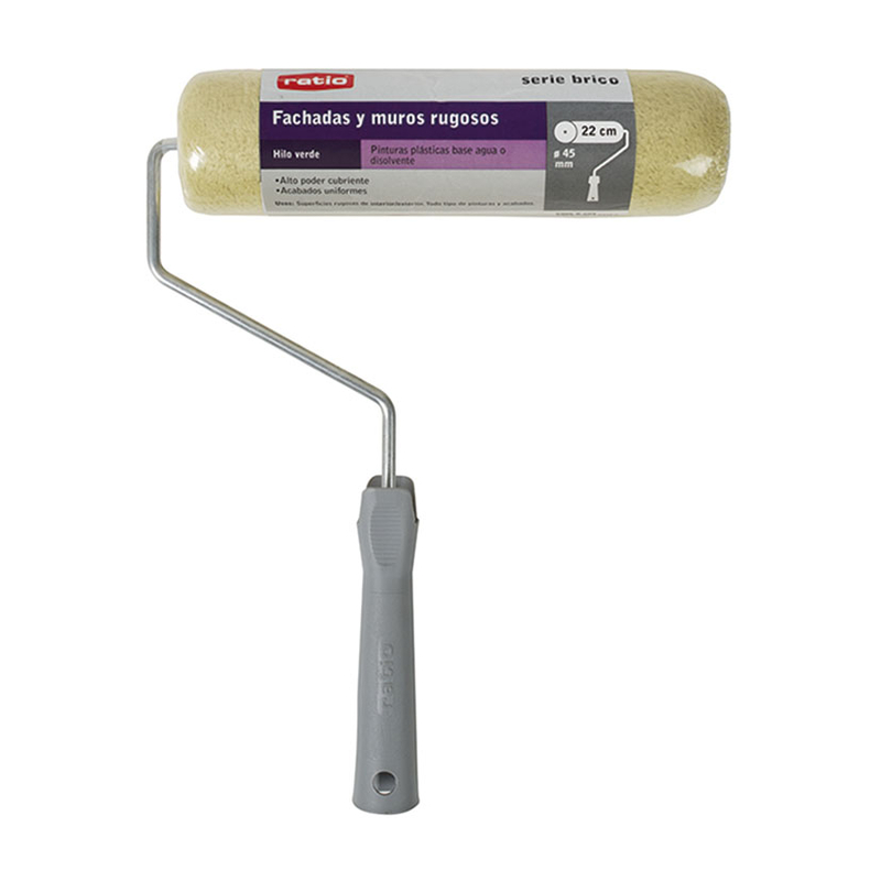 Este rodillo RATIO serie profesional de 22 cm está fabricado con hilo verde en 100% poliacrilico; es muy versátil y lo hace ideal ante trabajos de pintura para fachadas y muros rugosos. Destaca por su poder cubriente que te proporcionará unos grandes acabados uniformes. Está recomendado para pinturas plásticas a base de agua o disolvente. Su empuñadura es bimaterial y ergonómica para un fácil agarre. La varilla del rodillo está fabricada en acero y tiene un diámetro de 6 mm. Está disponible en diferentes diámetros.