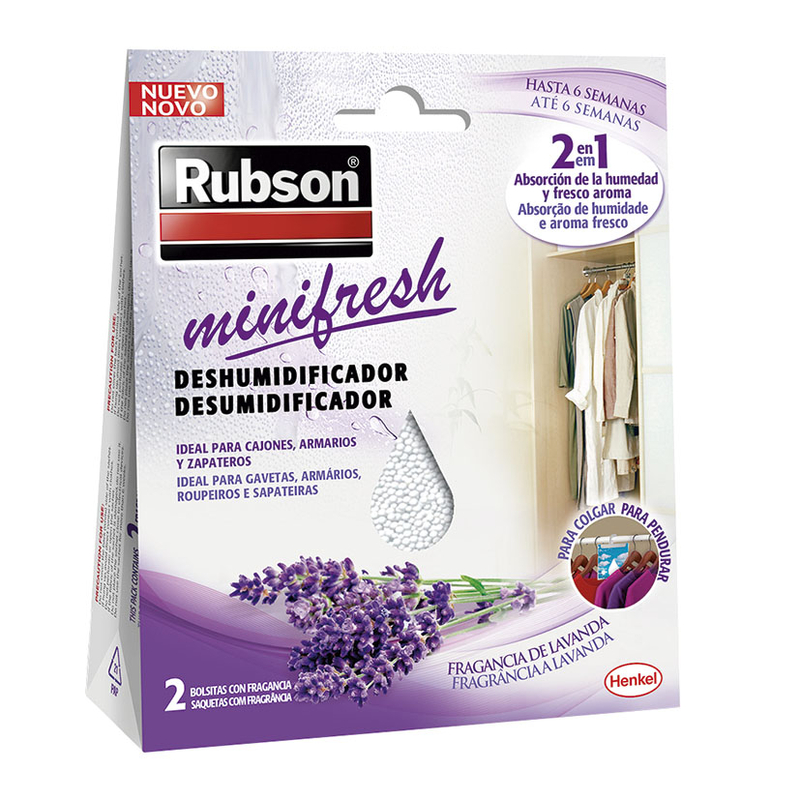 «Rubson Minifresh es un deshumidificador y ambientador con aroma lavanda en formato percha, ideal para colgar o colocar en armarios, vestidores, cajones o zapateros, ya que aparte de su cómodo formato, no aporta riesgo de fuga.