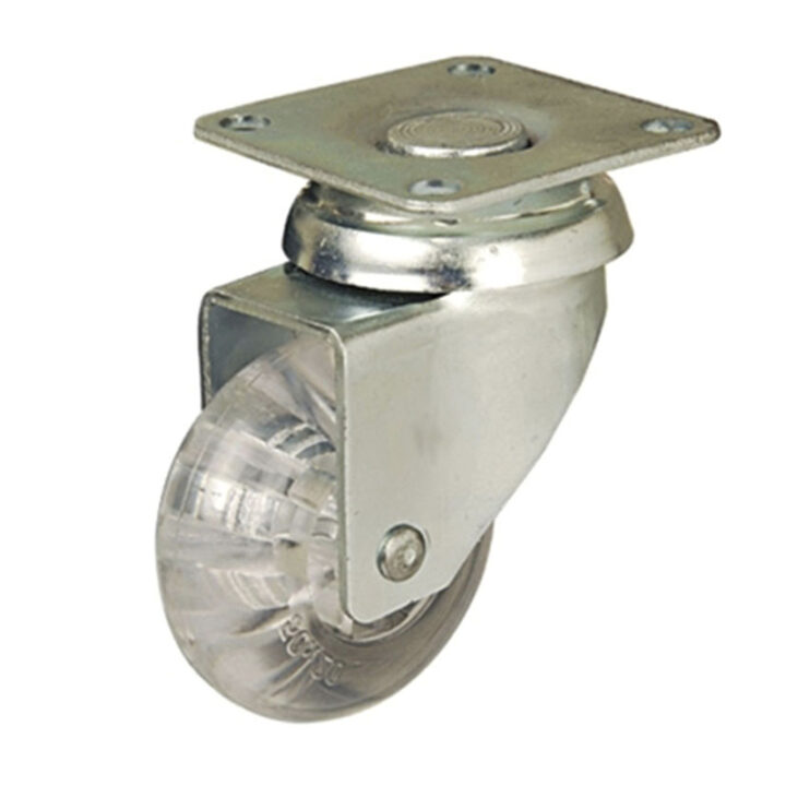 Esta rueda giratoria tiene el soporte fabricado en acero estampado de 2 mm de espesor con taladro pasador para tornillo. Tiene un acabado cincado brillante. Fijación por medio de pletina y base de sujeción horizontal. Incorpora una doble hilera axial de bolas de acero en rodamiento. El aro está fabricado en poliuretano transparente inyectado sobre núcleo de policarbonato con radios. Sin freno.