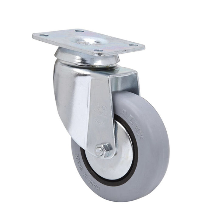 Rueda con soporte de doble rodamiento a bolas. Bandaje de goma gris inyectado sobre núcleo de poliamix. Tiene cojinete liso. Disponible en varias medidas y carga máxima. Cumple la normativa EN-12528/12530.