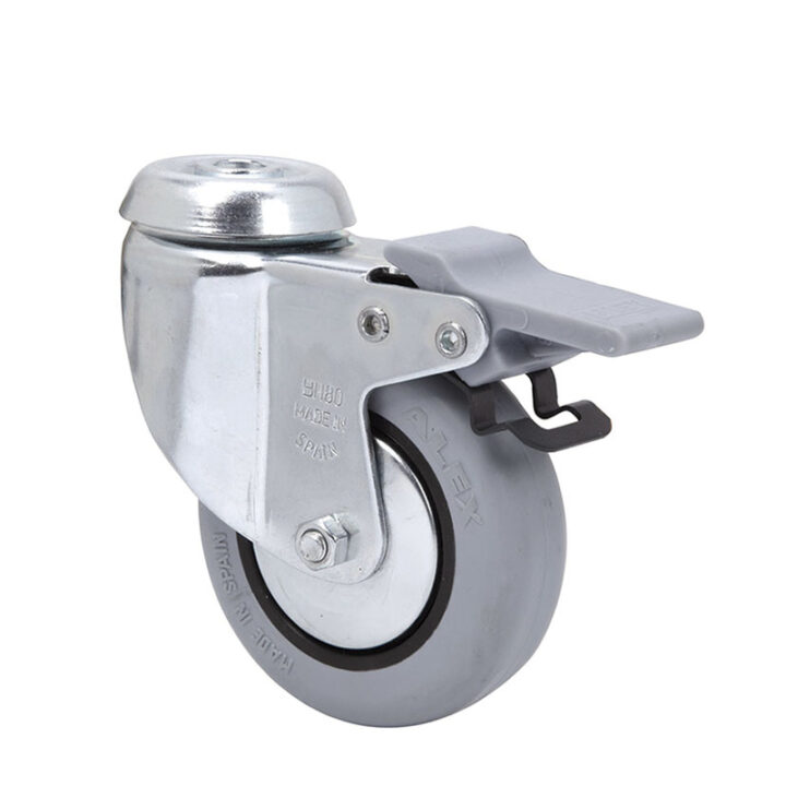 Rueda con soporte de doble rodamiento a bolas. Bandaje de goma gris inyectado sobre núcleo de poliamix. Tiene cojinete liso. Disponible en varias medidas y carga máxima. Cumple la normativa EN-12528/12530.