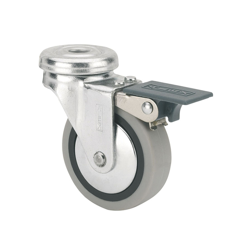 Rueda fabricada con chapa de acero embutida hasta 2 mm de espesor y acabado cincado. Soporte con rodamiento de bolas. La rueda tiene núcleo de poliamix y banda de goma gris. De cojinete liso. Está disponible en diferentes diámetros y carga máxima. Cumple la normativa EN-12528.