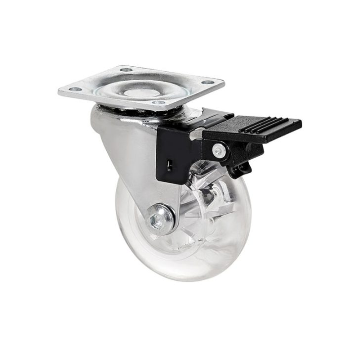 Rueda doméstica de la serie BDT-BDT núcleo de policarbonato y banda de rodadura transparente de poliuretano, es ideal para su uso en interiores. Tiene el soporte de chapa en acero con acabado cromado pulido, con pletina giratoria y freno. Es de color transparente. Soporta una carga máxima de 50 kg. Puedes complementar la información de este producto consultando la ficha técnica que tenemos colgada en nuestra web.