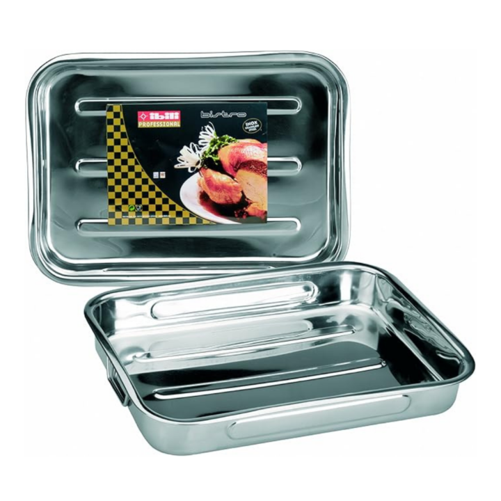Rustidera de acero inoxidable Ibili Bistrot de 38x27x6,5 cm con asas abatibles, capacidad de 5,1 litros. Apta para horno y lavavajillas, ideal para asar y hornear con comodidad.