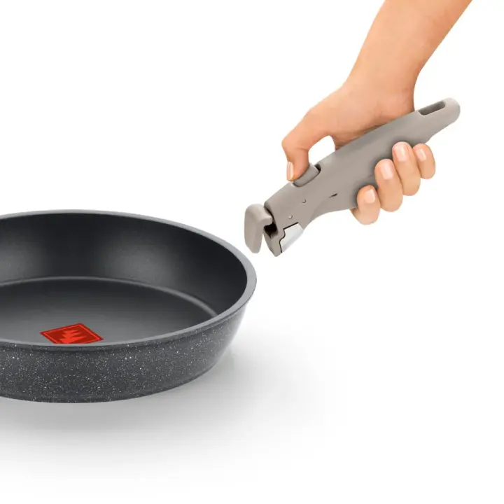 Esta sartén apilable está diseñada para ofrecer un alto rendimiento en la cocina, optimizando el espacio de almacenamiento gracias a su diseño compacto y a su mango desmontable One Click, que garantiza un agarre seguro y una fácil colocación y retirada con un solo click.