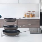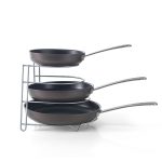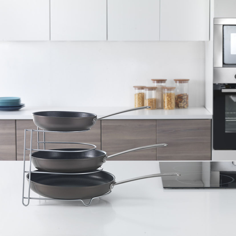 Este sartenero de la marca METALTEX está fabricado en metal con doble protección al óxido y gracias a su acabado en Polytherm®, en color gris plata, hace de este soporte sea anti-estático. Además, es muy fácil de limpiar. Podrás organizar fácilmente tus sartenes en el armario o cajón de tu cocina. Está compuesto por 4 huecos en diferentes alturas y tiene unas dimensiones de 27x23xh.23 cm.