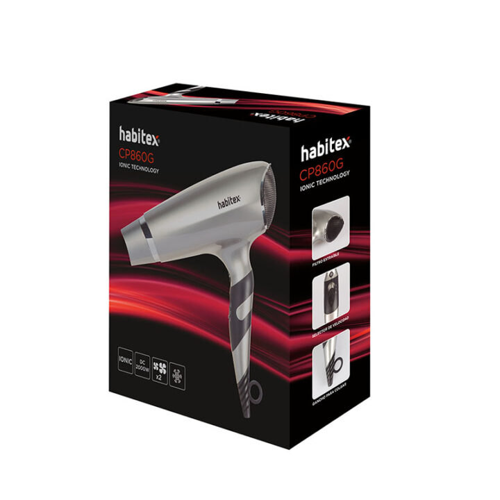 El secador HABITEX CP860G tiene un Motor DC Ionic Technology de 1800-2000W. Los iones evitan que tu pelo tenga electricidad estática dándole un aspecto sano y cuidado. Dispone de 2 velocidades y botón de golpe de aire frío. Incluye filtro extraíble para un buen mantenimiento, concentrador de aire y gancho para colgar. Negro mate + Gris silver. Se presenta en una caja y tiene 3 años de garantía.