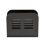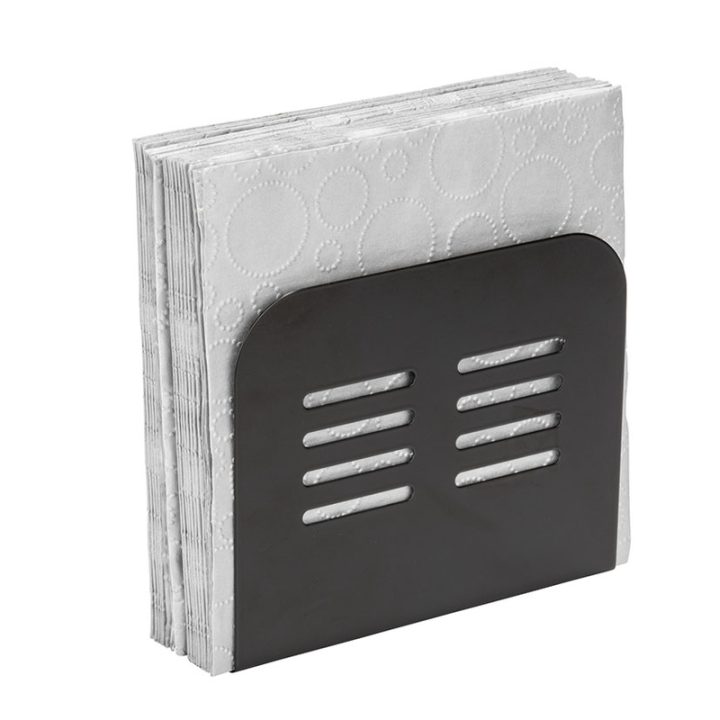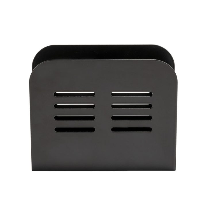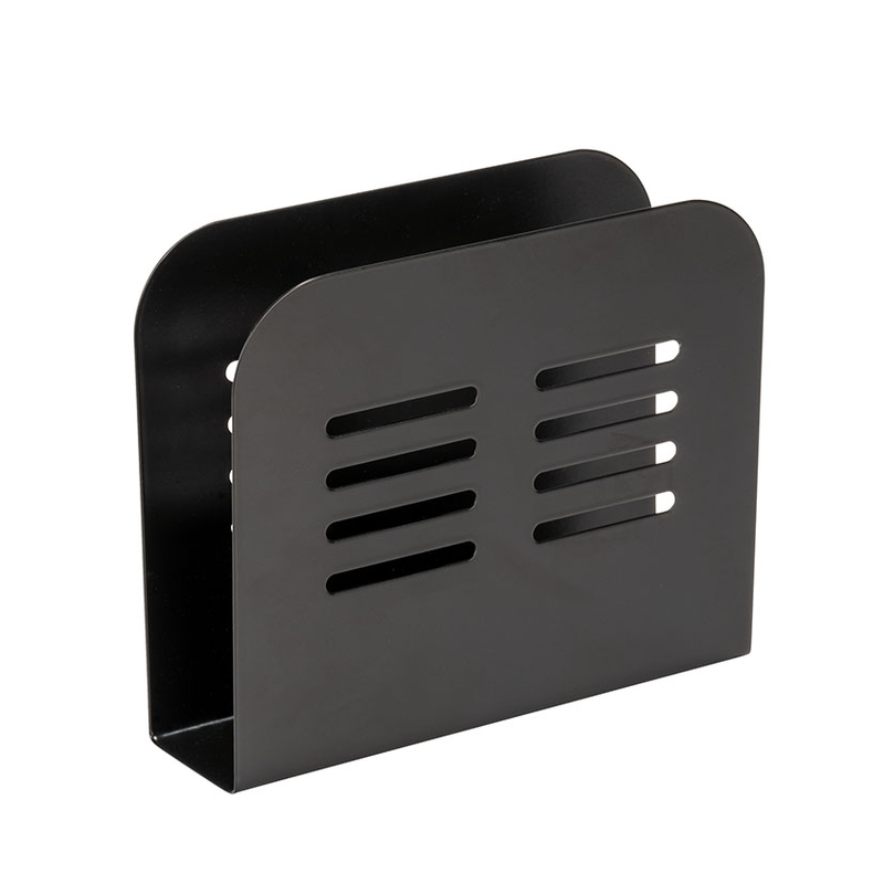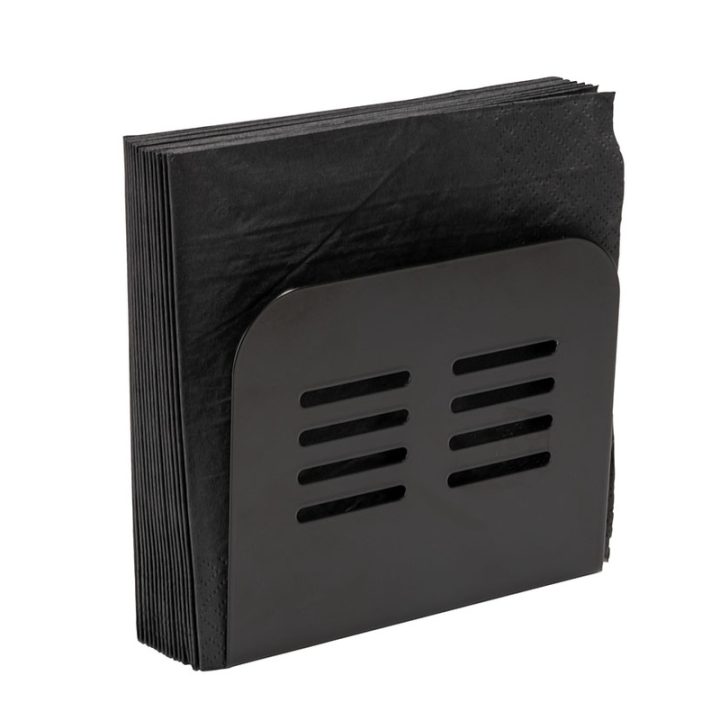 Este servilletero está fabricado en metal con recubrimiento en de polvo en color negro. Presenta un diseño modero y elegante para colocarlo en la mesa, la encimera o cualquier espacio limitado. Tiene unas dimensiones 15x4xh.12,5 cm, ideales para optimicar espacio.