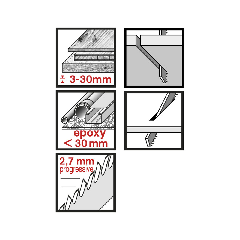 Sierra de calar especial para el corte en distintos tipos de materiales: madera, contrachapado y plástico. Su tipo de corte es fino gracias a su paso de diente de 2,7 mm. Puedes cortar tableros y materiales entre 3-30 mm. El set de 25 sierras viene presentado en un blíster.