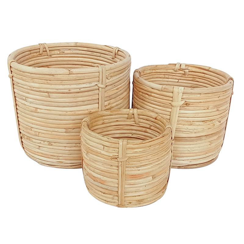 La belleza natural del ratán se combina con un diseño cilíndrico simple pero elegante, que se adapta fácilmente a una variedad de estilos de decoración, desde lo bohemio hasta lo moderno. Estas cestas son una forma práctica y estéticamente agradable de mantener tu hogar organizado mientras añades un toque de encanto natural.