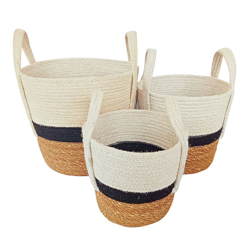 Cada cesta está Fabricadas en yute/anea de alta calidad para una durabilidad excepcional y un aspecto rústico encantador. Diseño tricolor que combina tonos blanco, negro y natural, añadiendo un toque de elegancia y modernidad a cualquier espacio. Incluyen asas que facilitan su transporte, permitiéndote llevarlas de un lugar a otro con facilidad. Perfectas para organizar una variedad de objetos, como revistas, juguetes, mantas, plantas y más, en tu sala de estar, dormitorio, baño o cualquier otro lugar de tu hogar.