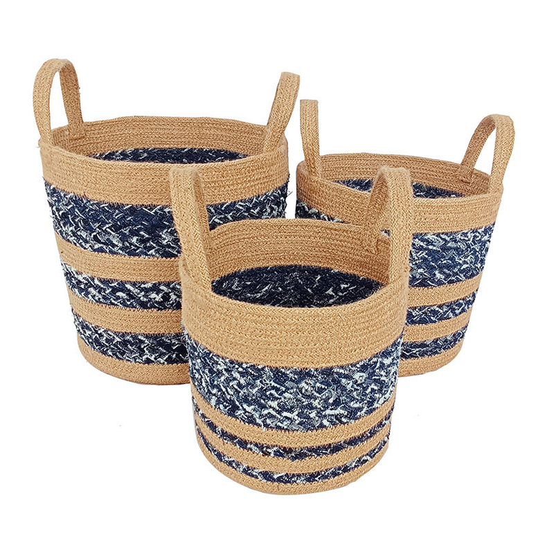 El Set 3 de cestas cilíndricas de fibra natural con asas Estambul e fibra natural Estambul ofrece una combinación encantadora de funcionalidad y estilo para tu hogar. Estas cestas están elaboradas con una mezcla de yute y algodón reciclado en tonos azul y blanco, lo que les da un aspecto fresco y relajado que evoca la sensación de la costa mediterránea. Las asas facilitan el transporte y movimiento de las cestas según sea necesario.