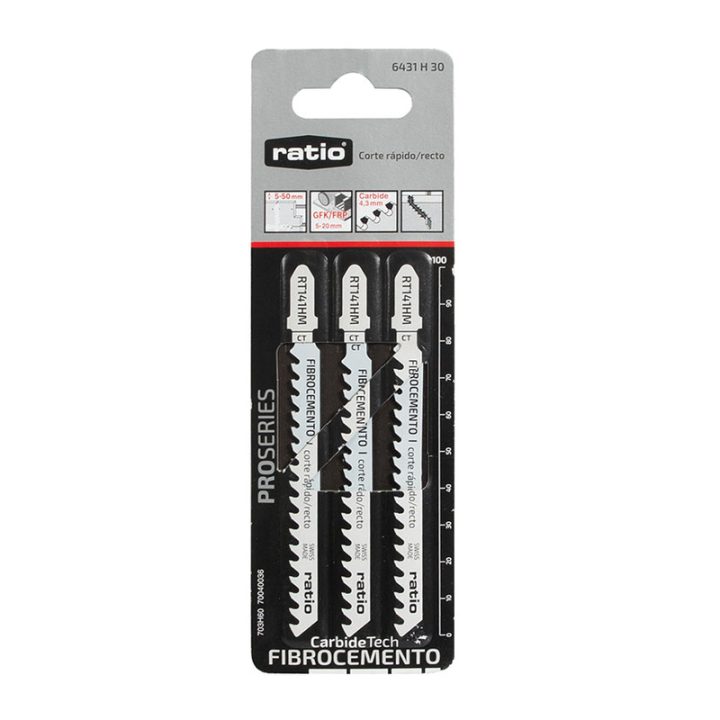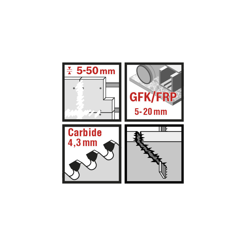 Sierra de calar especial para el corte en GFK/epoxi (5-20mm), pladur y placas de fibrocemento entre 5-50 mm de grosor. Su tipo de corte es rápido/recto, su paso de diente es de 4,3 mm. El set de 3 sierras viene presentado en un blíster.