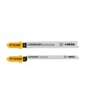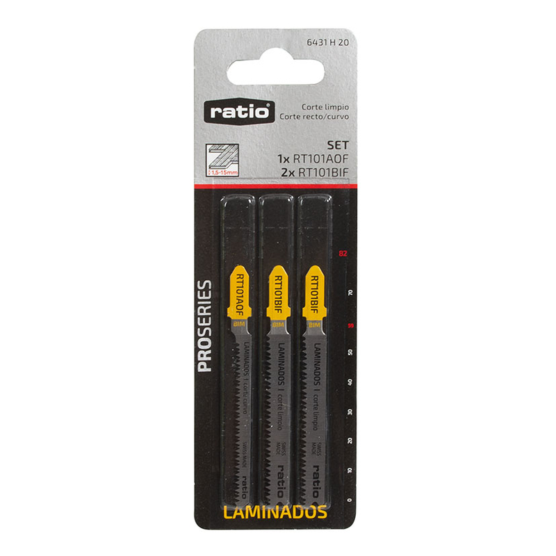 Sierra de calar especial para el corte en distintos tipos de materiales: laminados, tableros revestidos de plástico/HPL y tableros múltiples entre 1,5-15 mm. Su tipo de corte es recto/curvo, su paso de diente es progresivo de 1,7-1,4 mm. . El set de 3 sierras viene presentado en un blíster y está compuesto por: