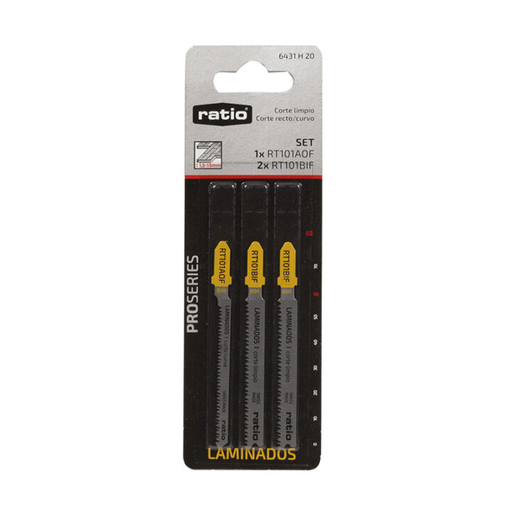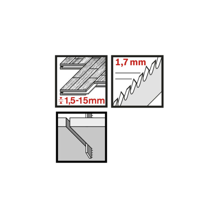 Sierra de calar especial para el corte materiales laminados tableros revestidos de plástico/HPL y tableros múltiples entre 1,5-15 mm. Su tipo de corte es limpio/recto, su paso de diente de 1,7 mm. El set de 3 sierras viene presentado en un blíster.