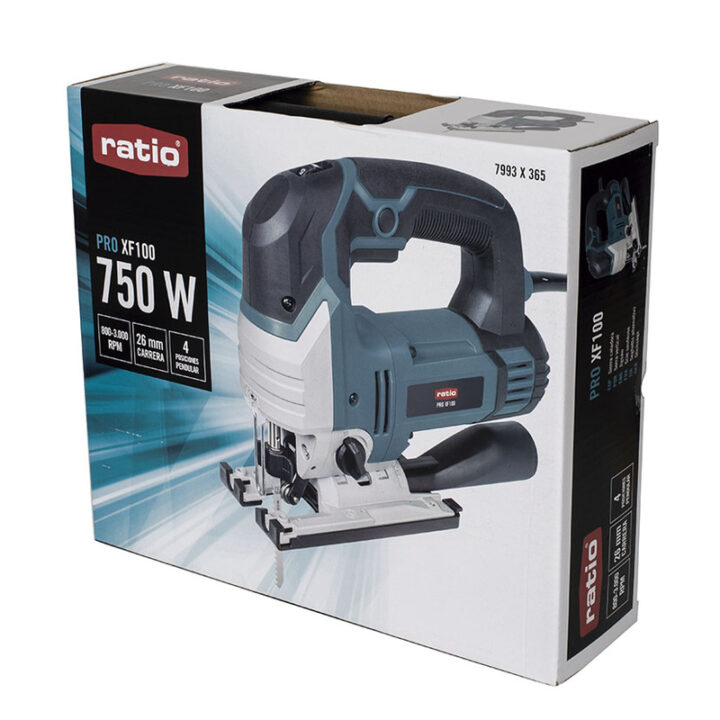 El tamaño compacto de la sierra de calar RATIO Pro XF100 el peso reducido y su excelente manejo, te proporcionarán un gran confort y un excelente control de la herramienta. Su caja de engranajes está fabricada en aluminio. Cuenta con pendular de 4 posiciones, velocidad variable, empuñadura bimaterial, luz de LED y bloqueo del interruptor para una mayor seguridad. Además, incorpora un tubo extractor de polvo. Gracias al potente motor de 750W, es capaz de alcanzar una óptima profundidad de corte en madera. Además, podrás realizar cualquier tipo de trabajo, sin problemas. Incluye como accesorios: 2 hojas de corte para madera, 2 para metal, 2 para el aluminio y un maletín de transporte, para que puedas guardarla cómodamente y llevarla donde precises. Se presenta en una caja.