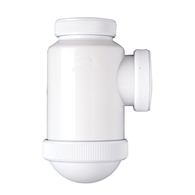 Sifón botella fabricado en polipropileno salida horizontal ø32 para instalar con tubos lisos, altura total 131. La altura de sifón 50 mm. Cumple con la norma UNE EN 274 y se presenta en bolsa.