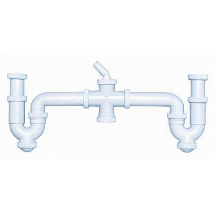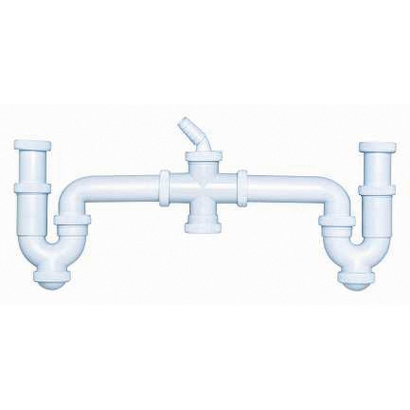 Sifón curvo doble con racors extensibles y orientables. Tiene toma de electrodomésticos con tuercas locas. Se suministra con junta 1 1/2 x 32 mm de diámetro para reducir la salida de 1 1/2 a 1 1/4 . Viene presentado en una bolsa.