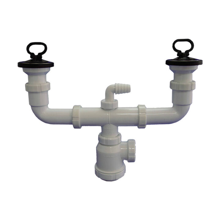 Sifón doble fabricado en polipropileno acero inoxidable y PVC con salida horizontal, doble válvula y toma de electrodomésticos