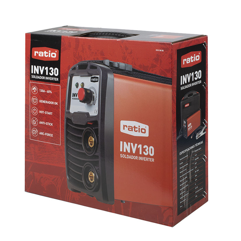 El modelo INV-130 A de RATIO es monofásico, ofrece la máxima fiabilidad y resistencia gracias a su sistema de construcción en doble carcasa y está equipado con los dispositivos Anti-Stick, Arc-Force y Hot-Start. Incorpora un maletín con juego de maza y pinza porta electrodos: rutilo, básico, aceroinox, hierro fundido, aluminio, como utensilios básicos en tus actividades de soldadura. Cuenta con una potencia de 130A., su potencia absorbida es de 5,06 Kva. y la regulación (mín-máx) es de 20-130 A. Puedes utilizar electrodos de hasta 3,25 mm de diámetro, continuo hasta 2,5mm y pesa 3 kg. Su grado de protección es de IP 21S. Se presentan en una caja.