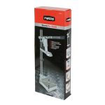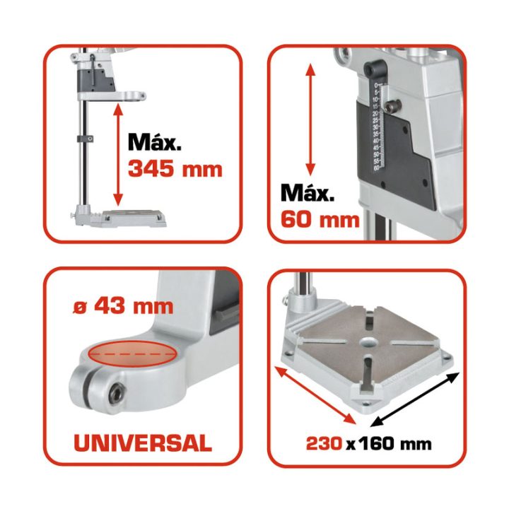 Este soporte cuenta con un adaptador universal de 43 mm para el cuello del taladro, base de trabajo fresada de 160×230 mm y homologación GS. Entre sus características técnicas, destaca la altura máxima de trabajo de 345 mm, el ajuste de profundidad de 60 mm y la columna de 50 mm. Se presenta en una caja.