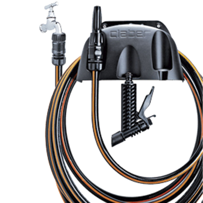 Compacto y práctico portamangueras de pared ideal para tener siempre a mano la manguera.