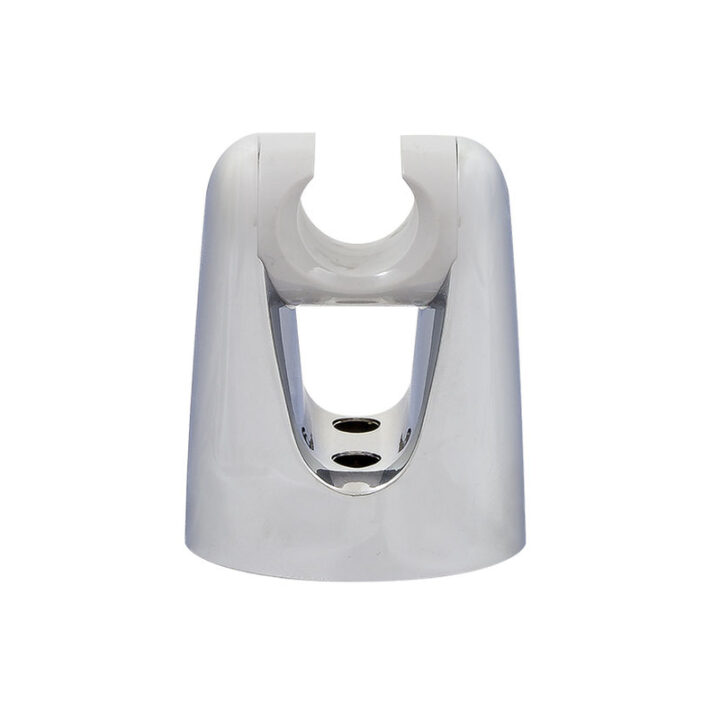 Soporte para mando de ducha simple fabricado en plástico con acabado cromado. Se presenta en una bolsa