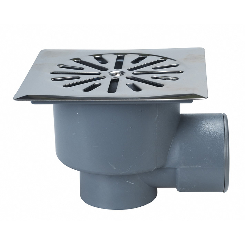 Sumidero sifónico de PVC y medidas de 125×125 mm con salida horizontal y vertical y de 50 y 40 mm de diámetro. Posee una rejilla de acero inoxidable.