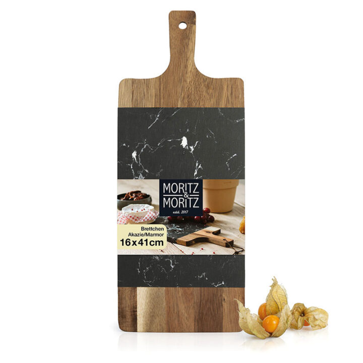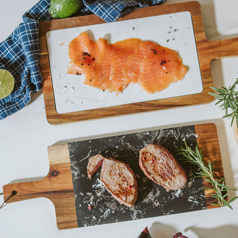La tabla está fabricada en madera de acacia maciza de alta calidad y una base de mármol negra extraíble. Se caracteriza porque es sumamente higiénica perfecta para decorar y servir alimentos variados. Además, es versátil e ideal para preparar la comida, como tabla de madera y excelente para presentar quesos gracias a la base negra de mármol. Tiene unas medidas de 41x16xh.1,5 cm