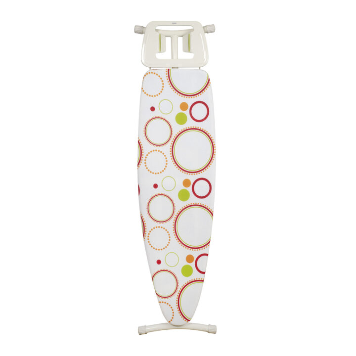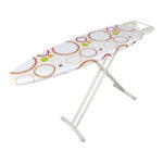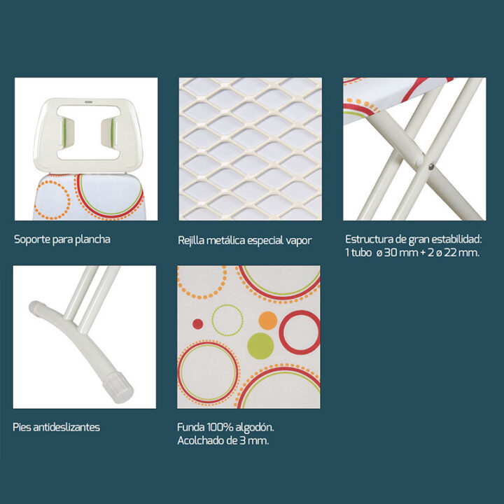 La mesa de planchar tiene una rejilla que está forrada mediante una funda de algodón estampado acolchado con grosor 5 mm. Dispone de regulación automática de altura hasta 92 cm, para tu mayor comodidad. 3 patas: 1 tubo ø 30 mm+ 2 tubo ø 22 mm. Además, dispone de un reposaplanchas tradicional con inserciones de silicona y pies antideslizantes para una mejor estabilidad de la tabla.
