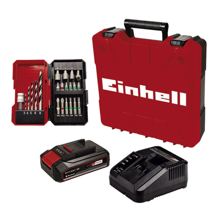 El taladro/Atornillador con percusión EINHELLcon motor sin escobillas tiene una potencia de 18V. La batería de litio influye de manera significativa en que esta herramienta sea extraordinariamente ligera y compacta, pero muy potente. Además, al no tener efecto memoria, garantiza una vida más larga del atornillador. Siempre estará listo para el uso con la tecnología de iones de litio sin autodescarga. Pertenece a la gama Power X-Change, libera toda su fuerza lejos de cualquier toma de corriente, lo que te permite un uso extremadamente flexible. Su diseño es ergonómico y su empuñadura de tacto suave, por lo que ofrece un manejo cómodo y maniobrable en uso prolongado. Dispone de portabrocas automático de 13 mm, reductor de 2 marchas para atornillar con fuerza y taladrar con rapidez, mango auxiliar y luz Led incorporada que garantiza un trabajo óptimo en zonas oscuras. Este taladro viene equipado con una batería Power X-Change de 2,5 Ah y un cargador. Además incluye una caja de puntas de 22 piezas y un maletían para que lo puedas transportar con facilidad.