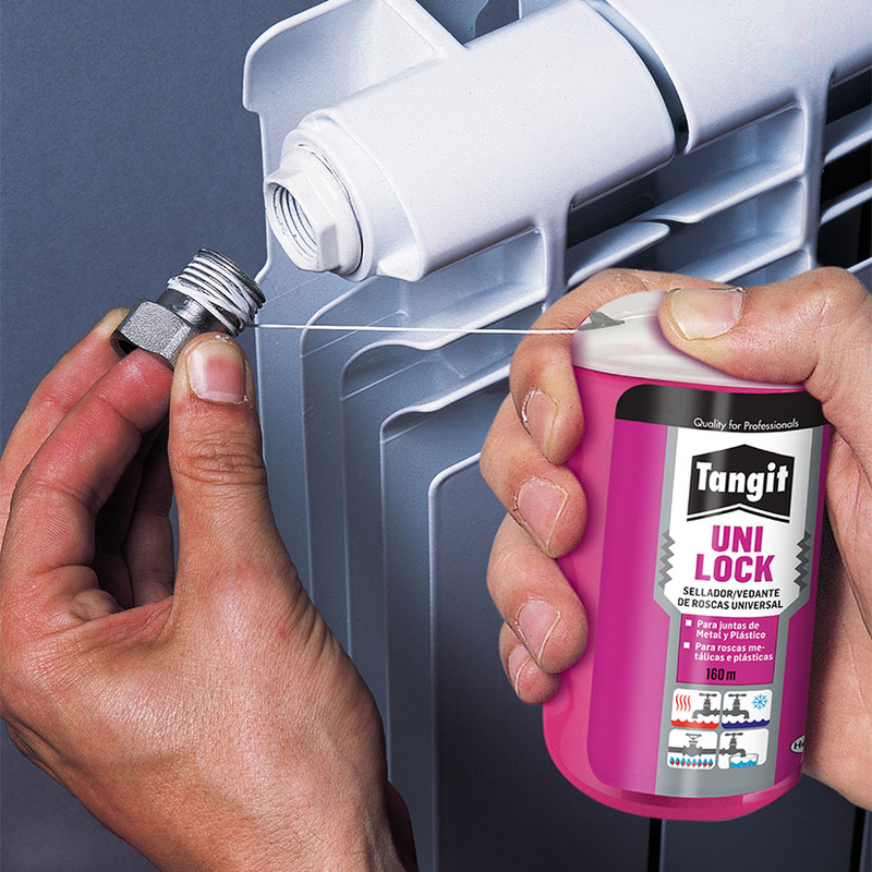 Tangit Uni-Lock es un sellador universal apropiado para conseguir la estanqueidad de uniones de tuberías roscadas plásticas y/o metálicas. Sustituye de forma práctica las cintas de teflón o cáñamo asegurando la estanqueidad entre las roscas.