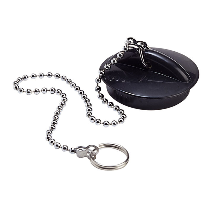 Tapón para fregadero de goma que se adapta a la mayoría de los fregaderos estándar. Consta de una cadena de 250 mm y anillas. Viene presentado en una bolsa.