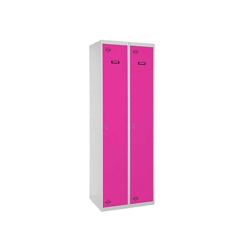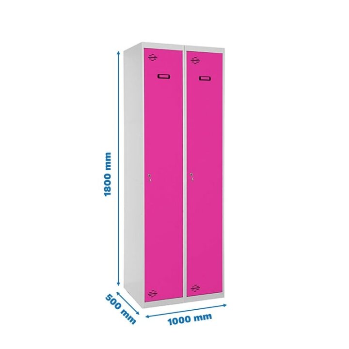 Taquilla metálica de 2 cuerpos con 2 puertas de color gris y las puertas rosas. Las dimensiones son 1800x1000x500 mms.