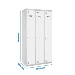 Taquilla metálica de 3 cuerpos con 3 puertas de color gris y las puertas blancas. Las dimensiones son 1800x1200x500 mms.