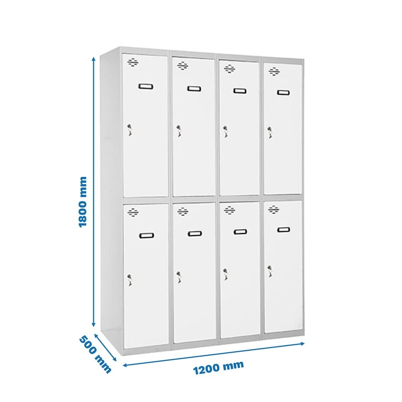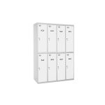 Taquilla metálica de 4 cuerpos con 8 puertas de color gris y las puertas blancas. Las dimensiones son 1800x1200x500 mms.