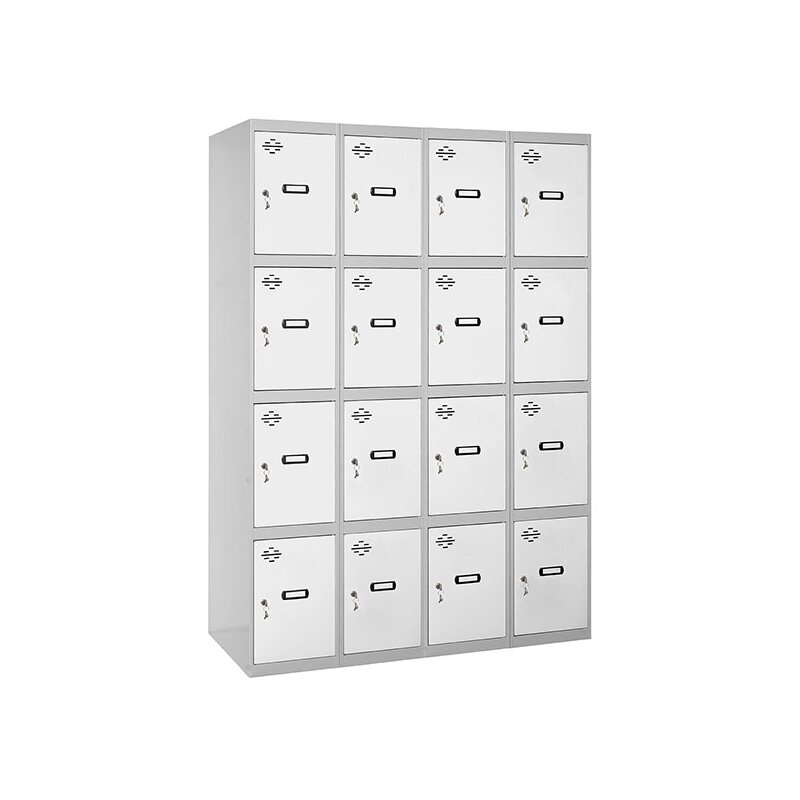 Casillero metálico de 4 cuerpos con 16 puertas de color gris y las puertas blancas. Las dimensiones son 1800x1200x500 mms.