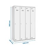 Taquilla metálica de 4 cuerpos con 4 puertas de color gris y las puertas blancas. Las dimensiones son 1800x1200x500 mms.