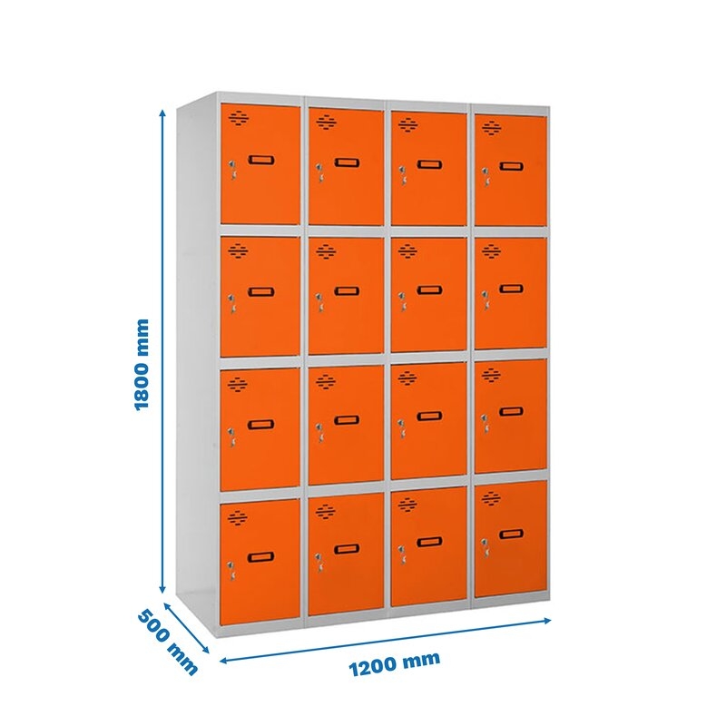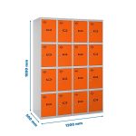 Casillero metálico de 4 cuerpos con 16 puertas de color gris y las puertas naranjas. Las dimensiones son 1800x1200x500 mms.