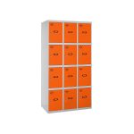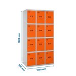 Casillero metálico de 3 cuerpos con 12 puertas de color gris y las puertas naranjas. Las dimensiones son 1800x1200x500 mms.