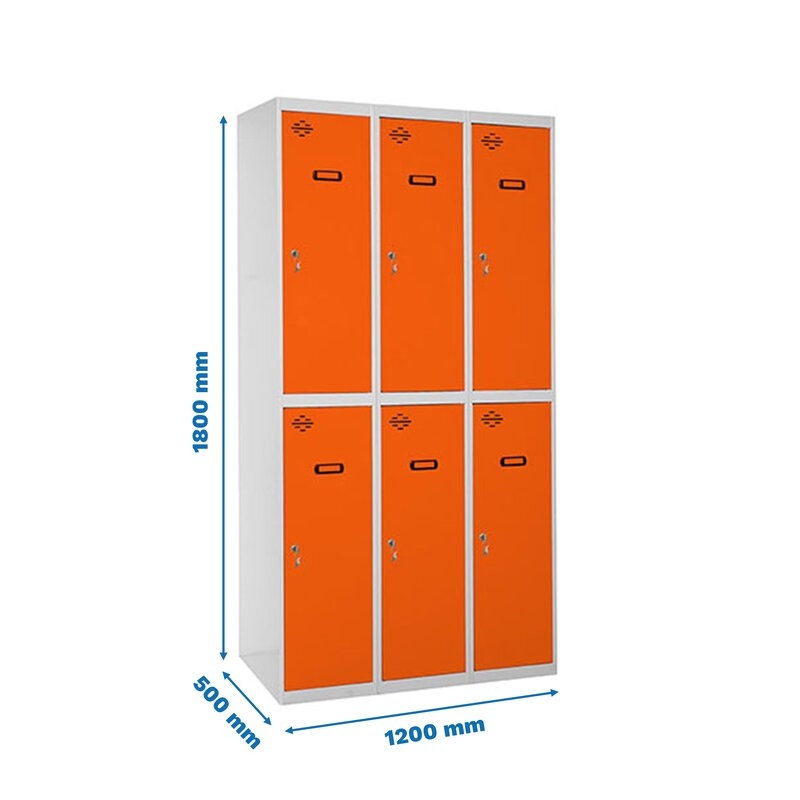 Taquilla metálica de 3 cuerpos con 6 puertas de color gris y las puertas naranjas. Las dimensiones son 1800x1200x500 mms.