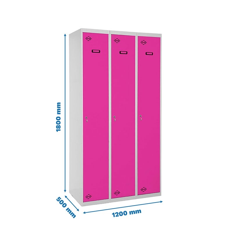 Taquilla metálica de 3 cuerpos con 3 puertas de color gris y las puertas rosas. Las dimensiones son 1800x1200x500 mms.
