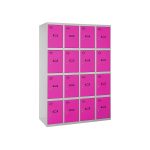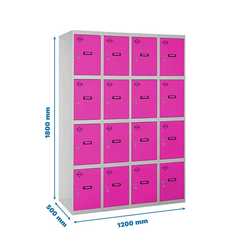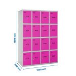 Casillero metálico de 4 cuerpos con 16 puertas de color gris y las puertas rosas. Las dimensiones son 1800x1200x500 mms.