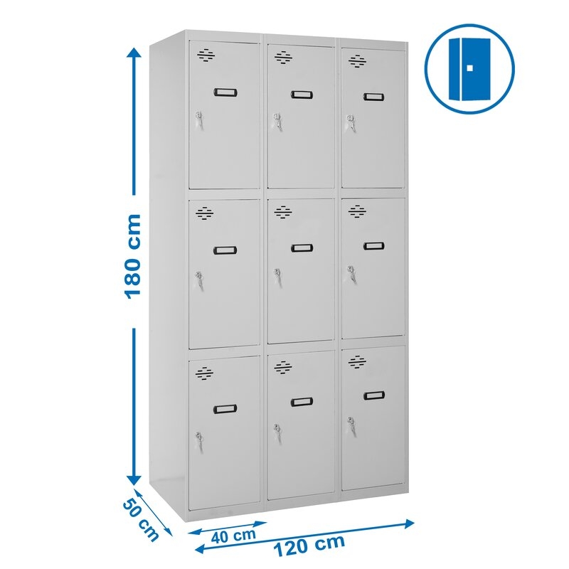 Casillero metálico de 3 cuerpos con 9 puertas de color gris. Las dimensiones son 1800x1200x500 mms. Se entrega montado e incluye una cerradura, respiradero y etiquetero para mayor comodidad del usuario.