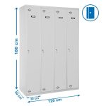 Taquilla metálica de 4 cuerpos con 4 puertas de color gris. Las dimensiones son 1800x1200x500 mms. Se entrega montado e incluye un estante, perchero, una cerradura, respiradero y etiquetero para mayor comodidad del usuario.